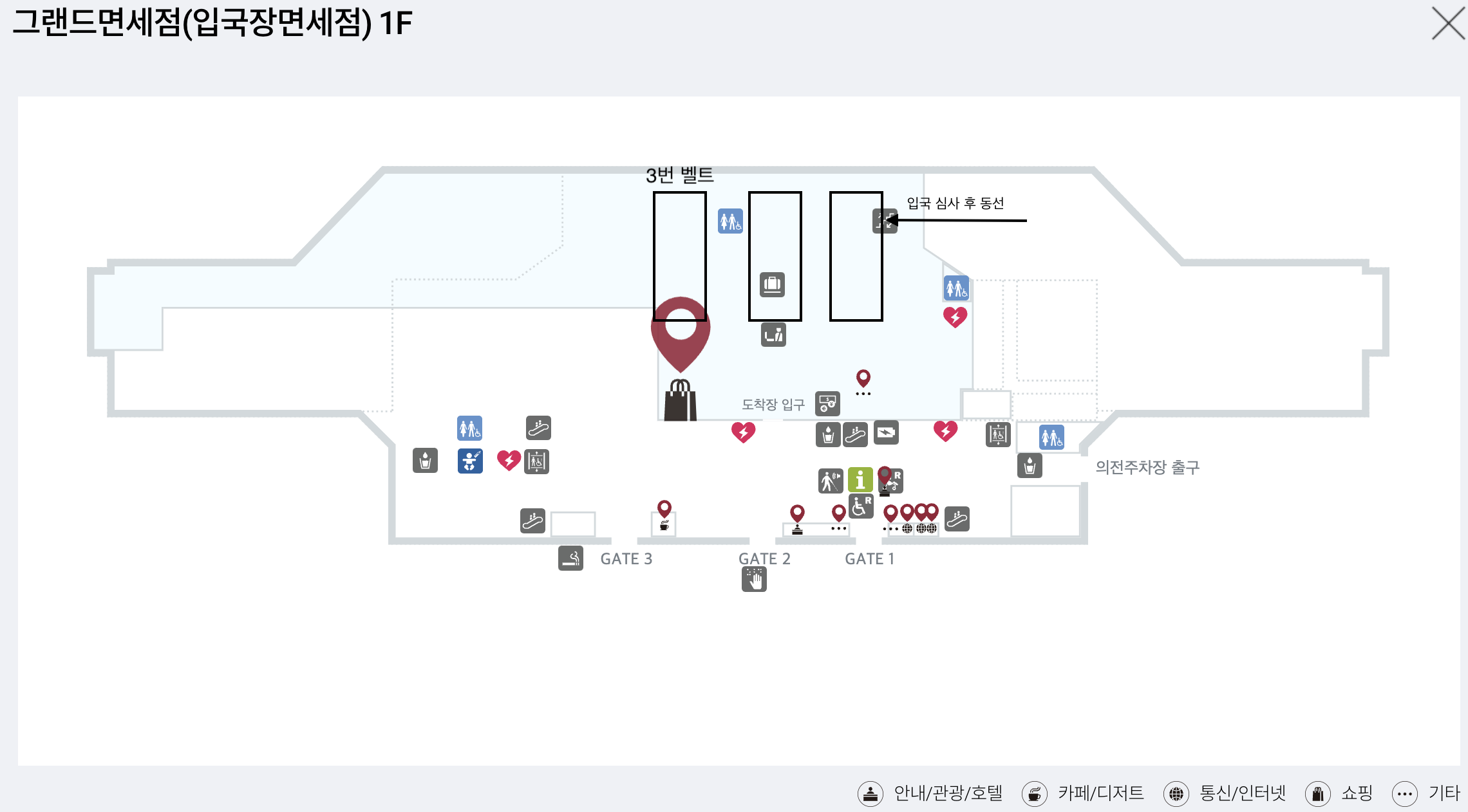 수하물 3번 벨트 앞 쪽 구석에 입국장 면세점이 있으며,