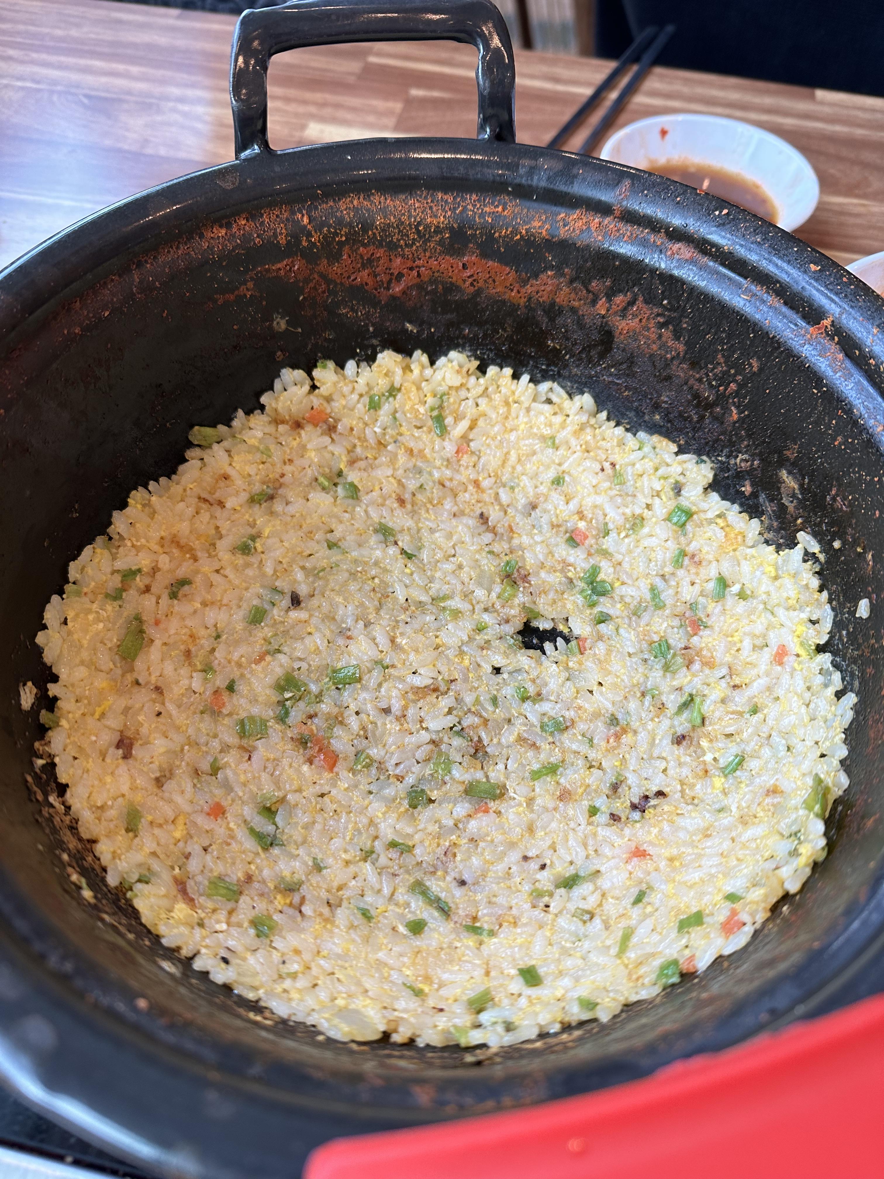 점원이 직접 볶아주는데, 이 볶음밥이 뭐랄까.. 중국집 볶음밥의 느낌도 나면서, 아래 눌러 붙은 누룽지의 식감이 일품이다.