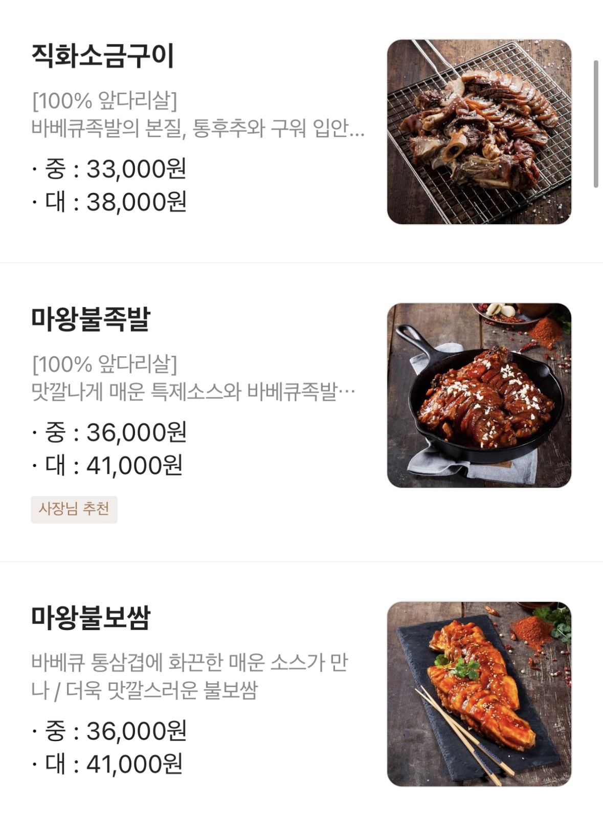 이번에 알게된 점인데, 마왕족발은 시그니쳐 마왕 통구이 외에도 많은 메뉴가 있다. 다음에는 보쌈구이나 직화 소금구이를 한번 도전해볼까 한다.