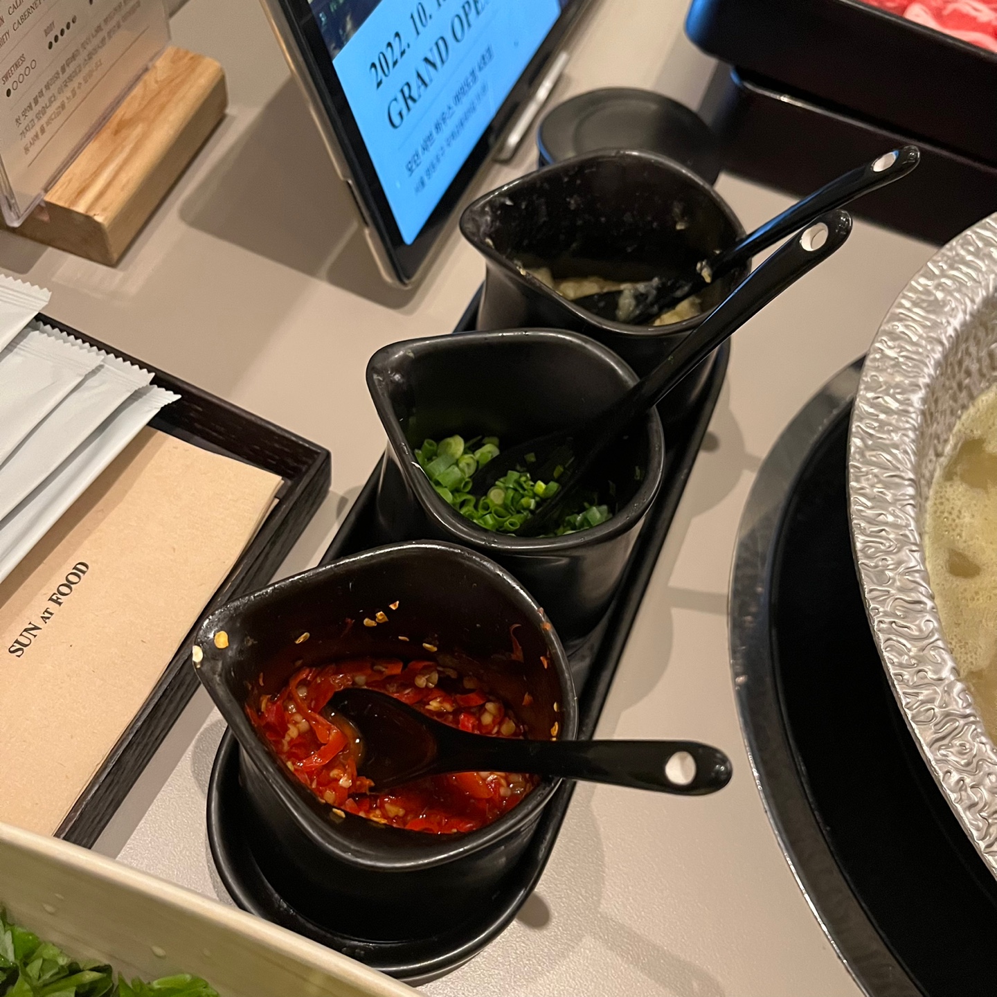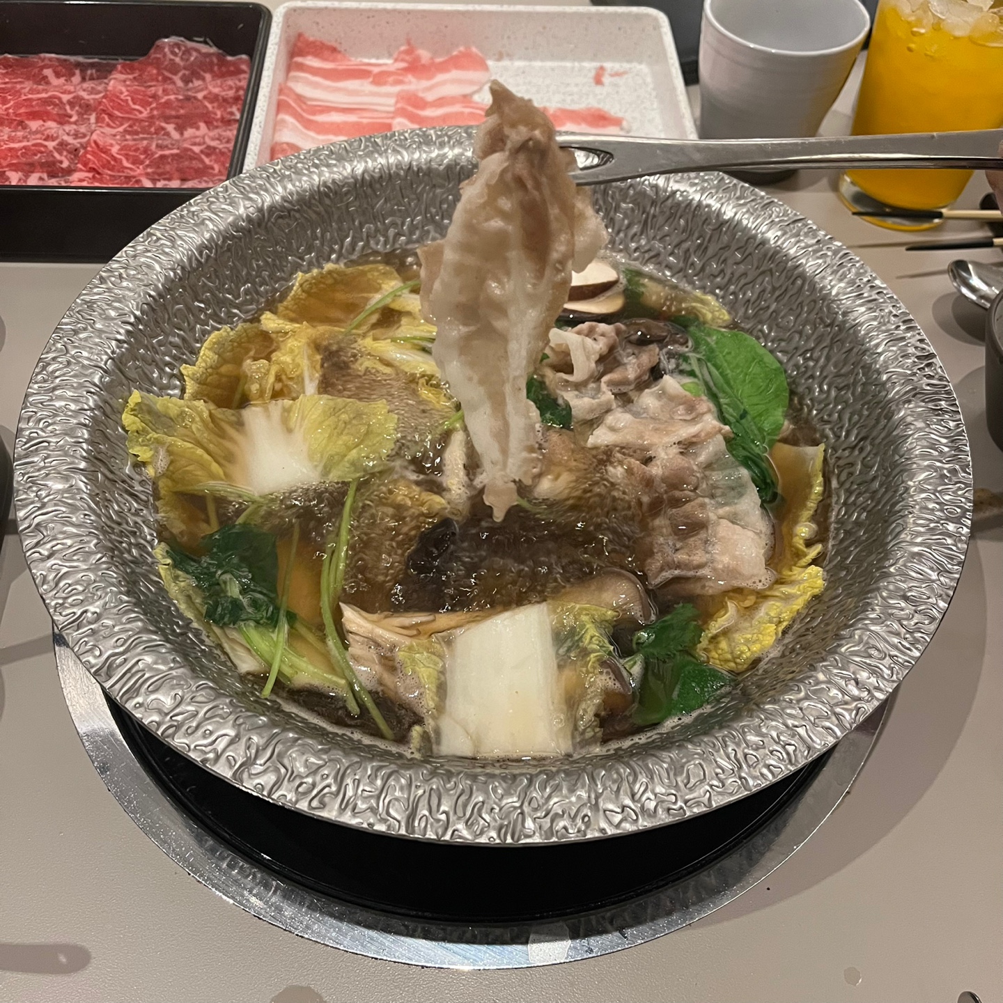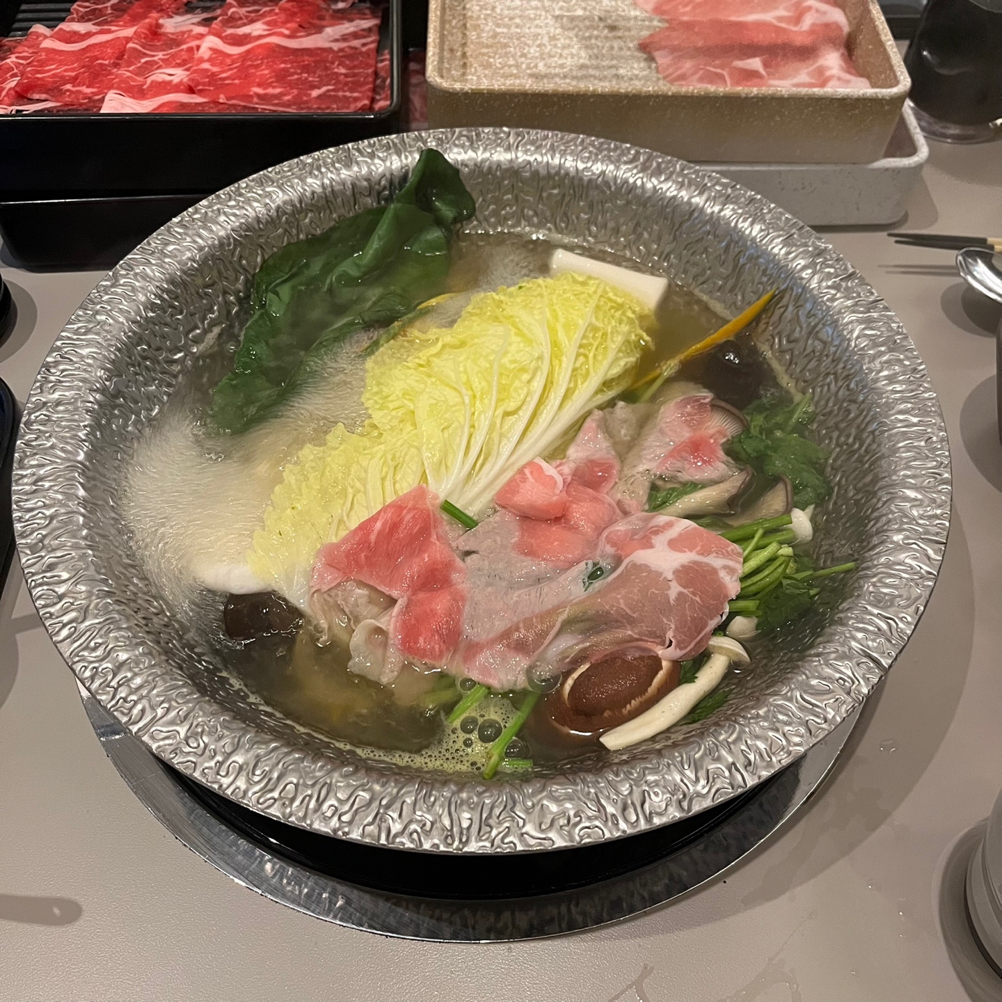 시그니쳐 메뉴의 재공부위, 좌측에 있는 것이 소, 우측이 돼지이다. 돼지고기 샤브샤브는 처음 먹어봤는데, 우리 입맛에는 소 보다는 돼지, 특히 삼겹살이 입맛에 맞았다.