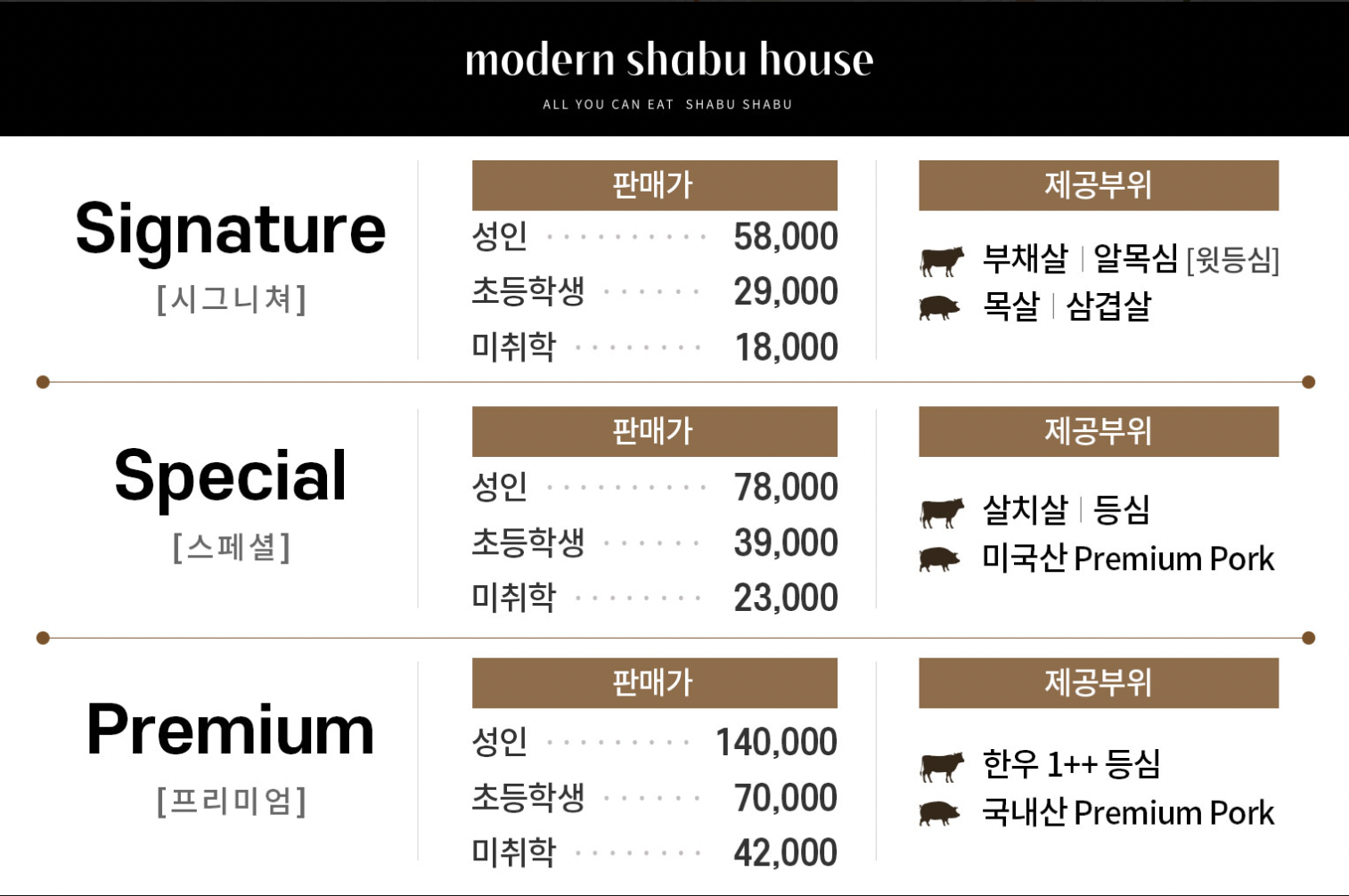 메뉴는 기본적으로 시그니쳐 / 스페셜 / 프리미엄으로 세 가지 구성이며, 고기의 종류만 차이가 있을 뿐, 다른 차이는 없다. 우리는 이 곳이 처음이기에 가장 기본인 시그니쳐 메뉴를 시켰다.