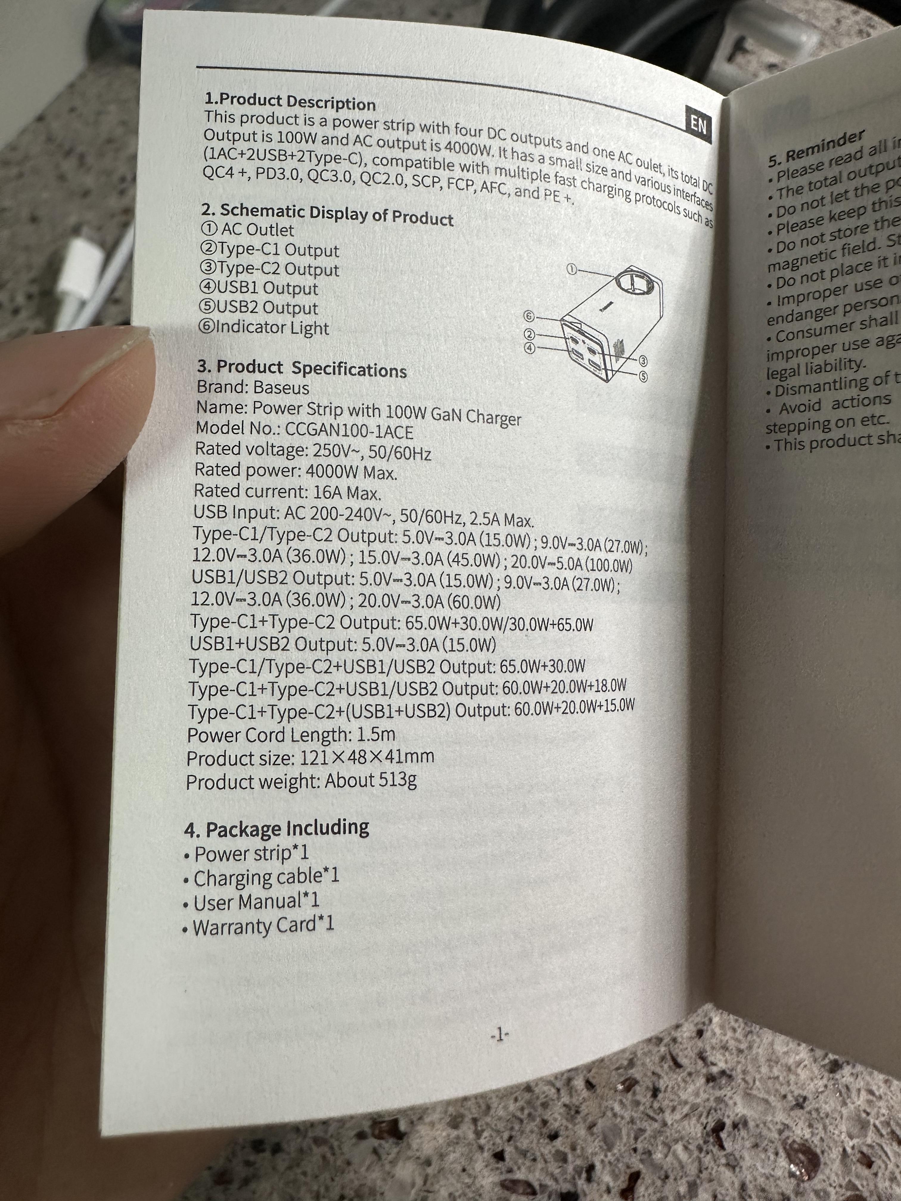 구성품은 충전기 본체와 100W 충전을 지원하는 USB C to C 케이블, 그리고 설명서와 스티커로 되어 있다.