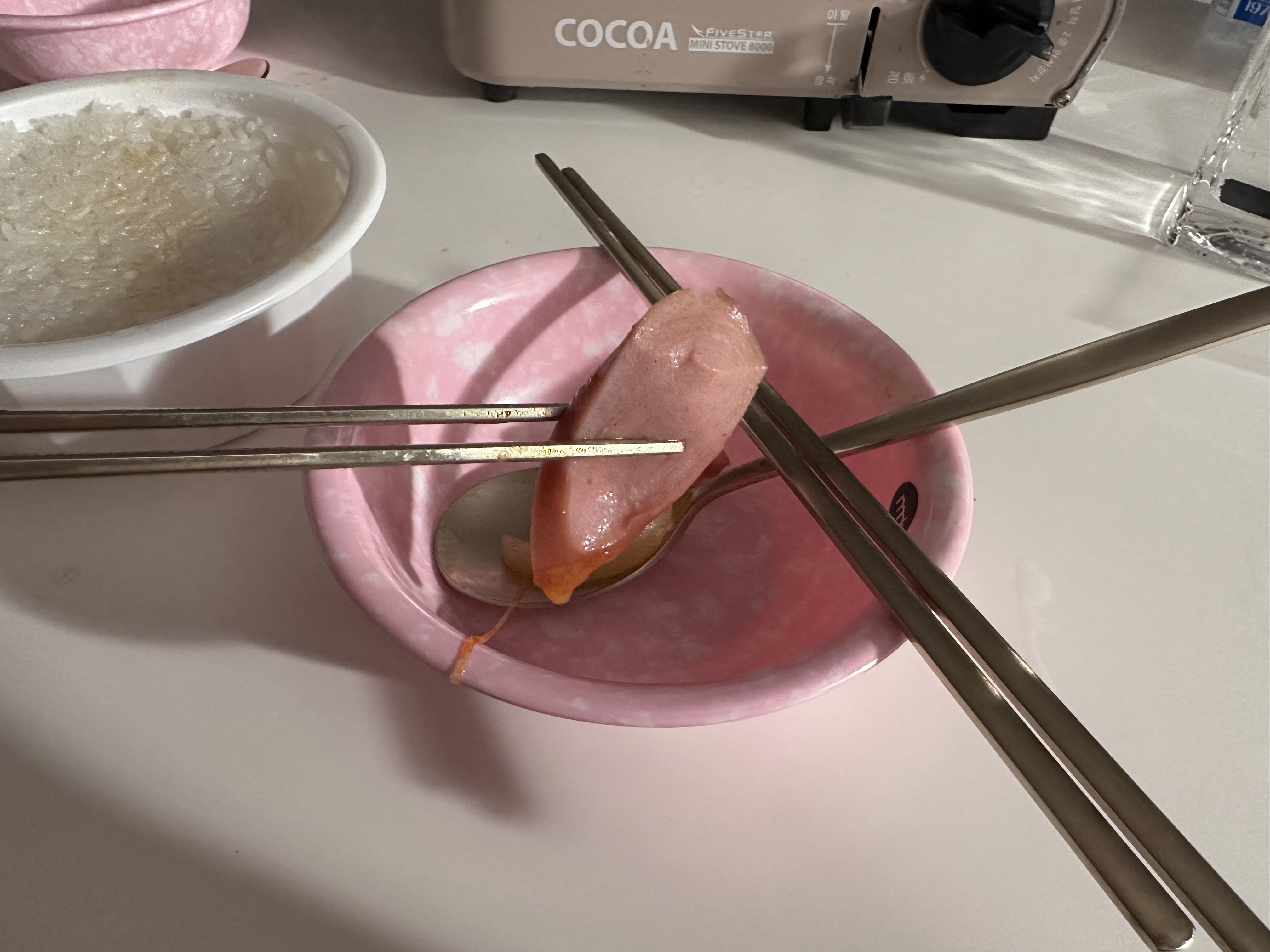 썰려있지 않은 후랑크 소세지 2개, 튤립햄 혹은 스팸 스타일의 두툼하게 썰려있는 햄 네 조각