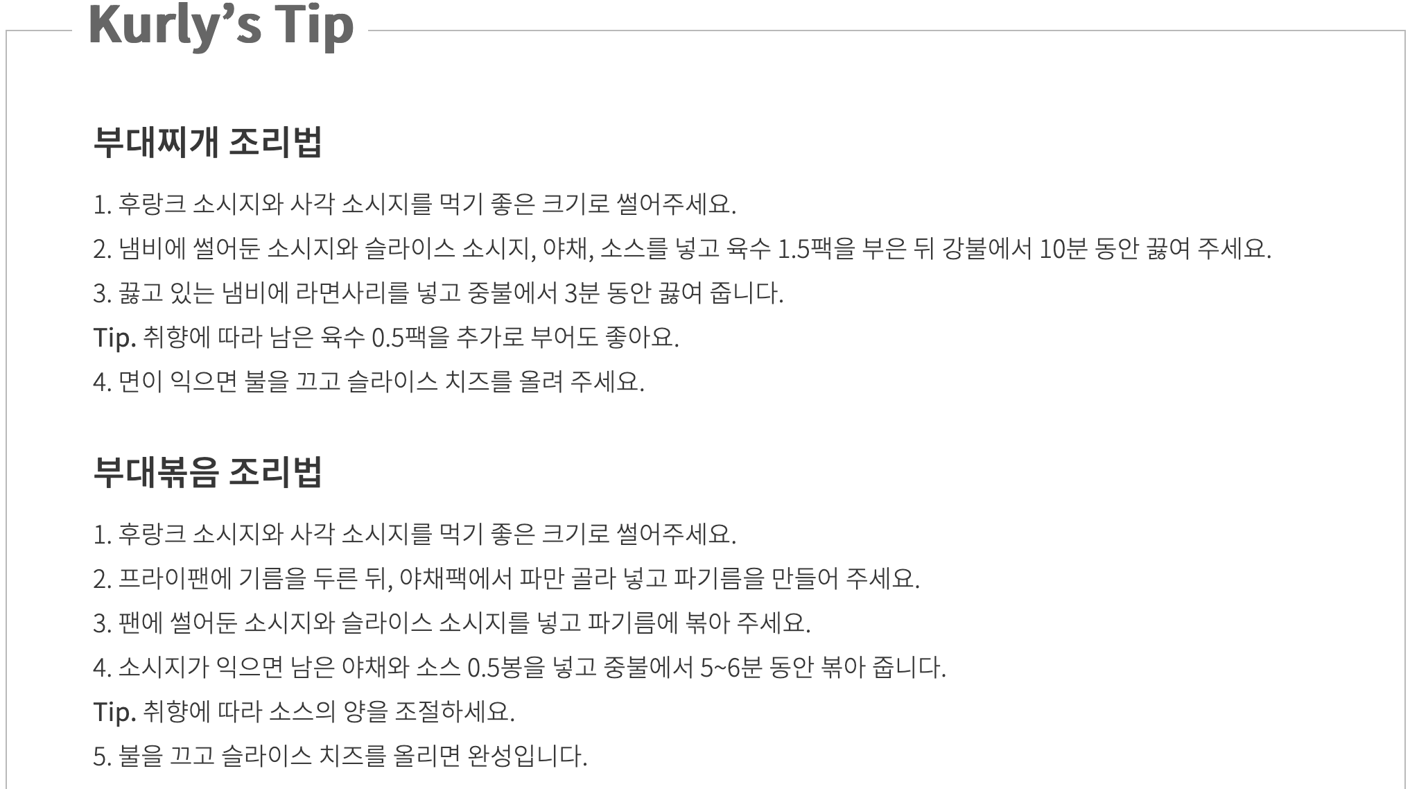 컬리에 따르면 조리는 찌개와 볶음으로 조리할 수 있는데, 나는 부대찌개로 먹었다.