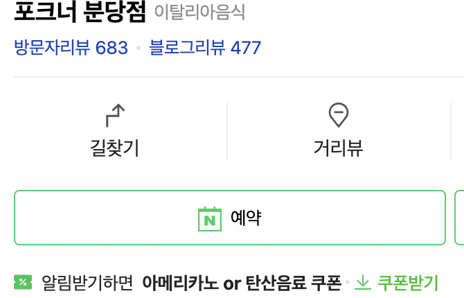 네이버에 포크너 분당 검색 시 아래 보이는 배너를 통해 음료 쿠폰을 받을 수 있다.