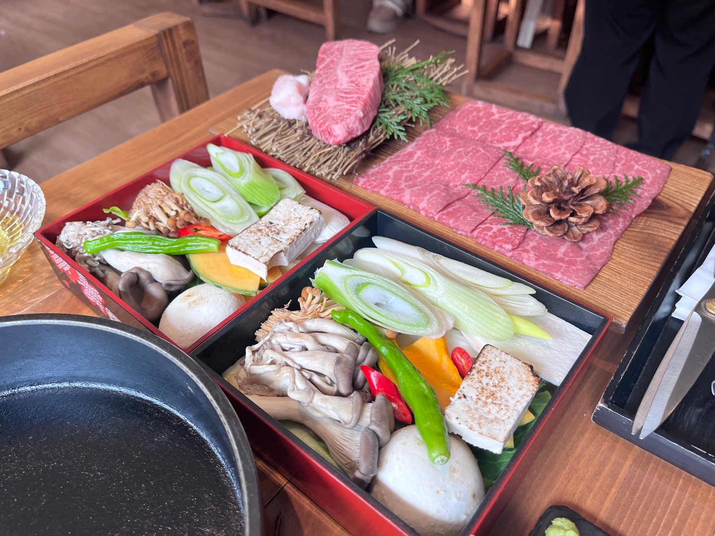 스테이크를 모두 굽고 난 후 스키야키 조리를 시작한다.
