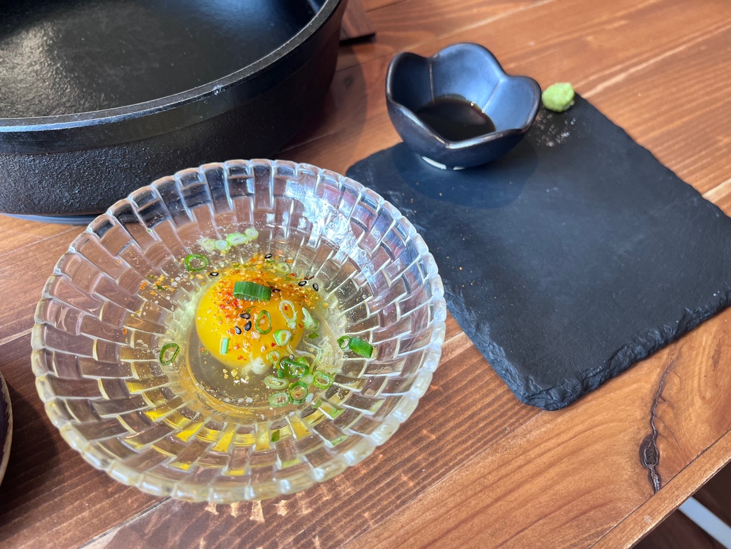 스키야키를 찍어 먹기 위한 계란 소스와 스키야키 전 즐길 구운 고기를 먹을 소스류가 함께 준비된다.