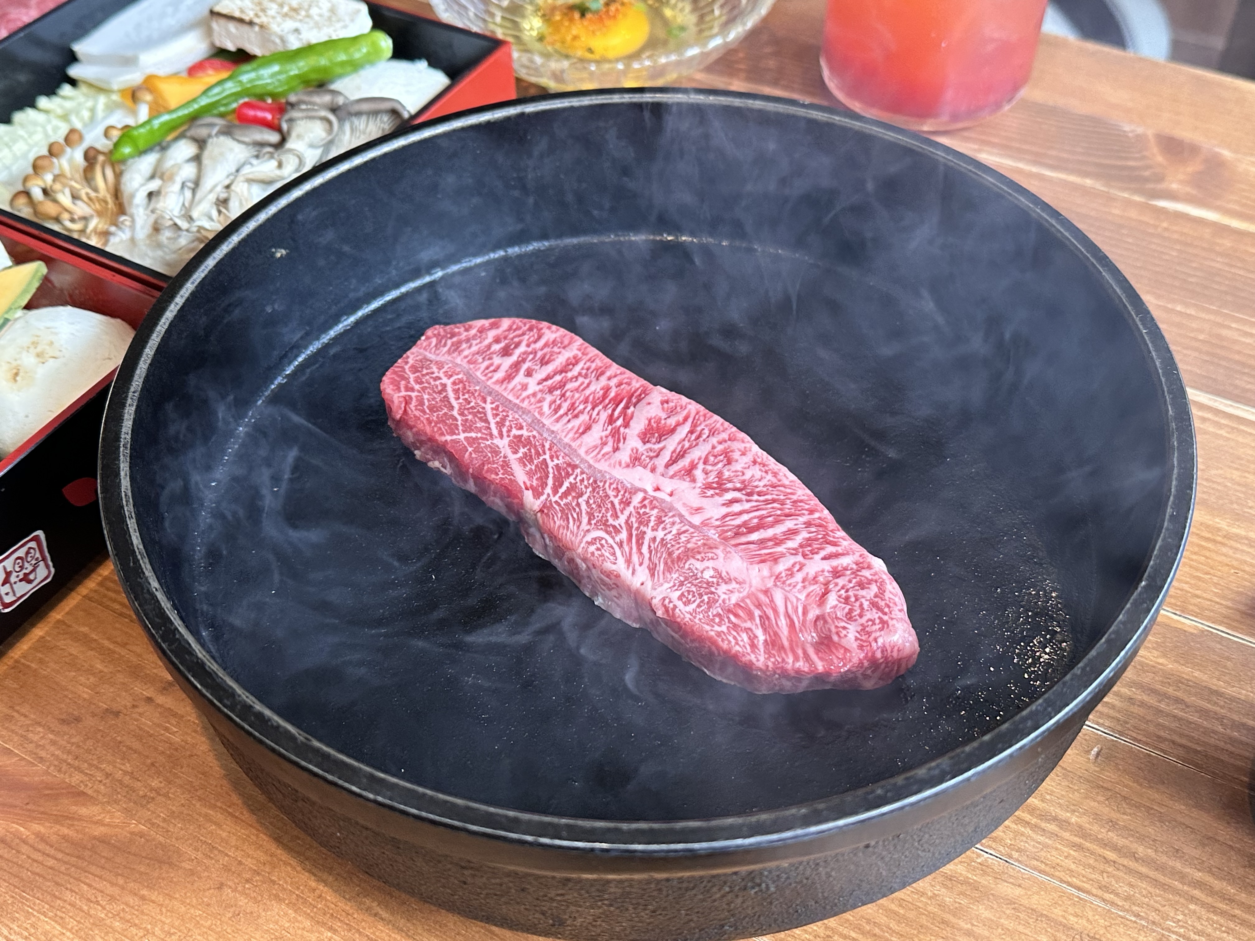 스테이크를 모두 굽고 난 후 스키야키 조리를 시작한다.
