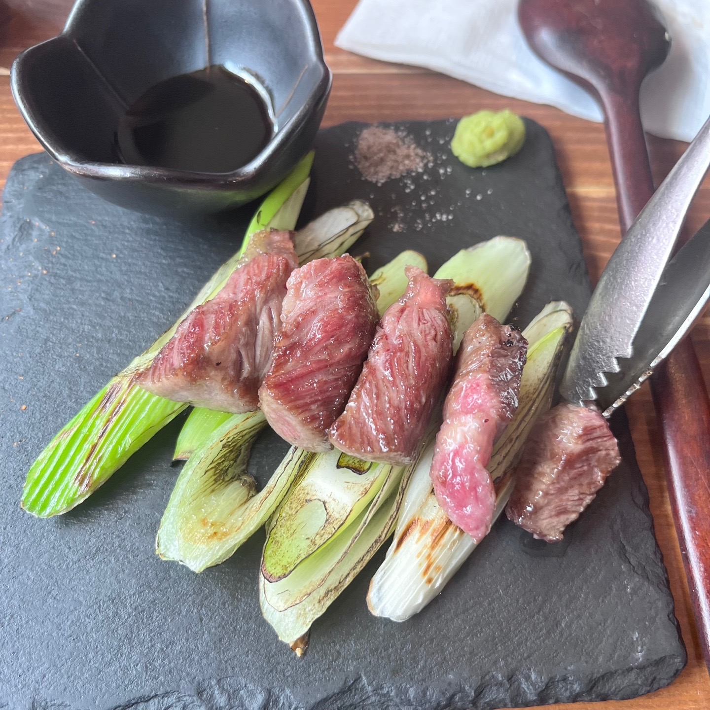 구워진 부채살 스테이크는 이쁘게 잘라 구운 대파 위에 올려준다.