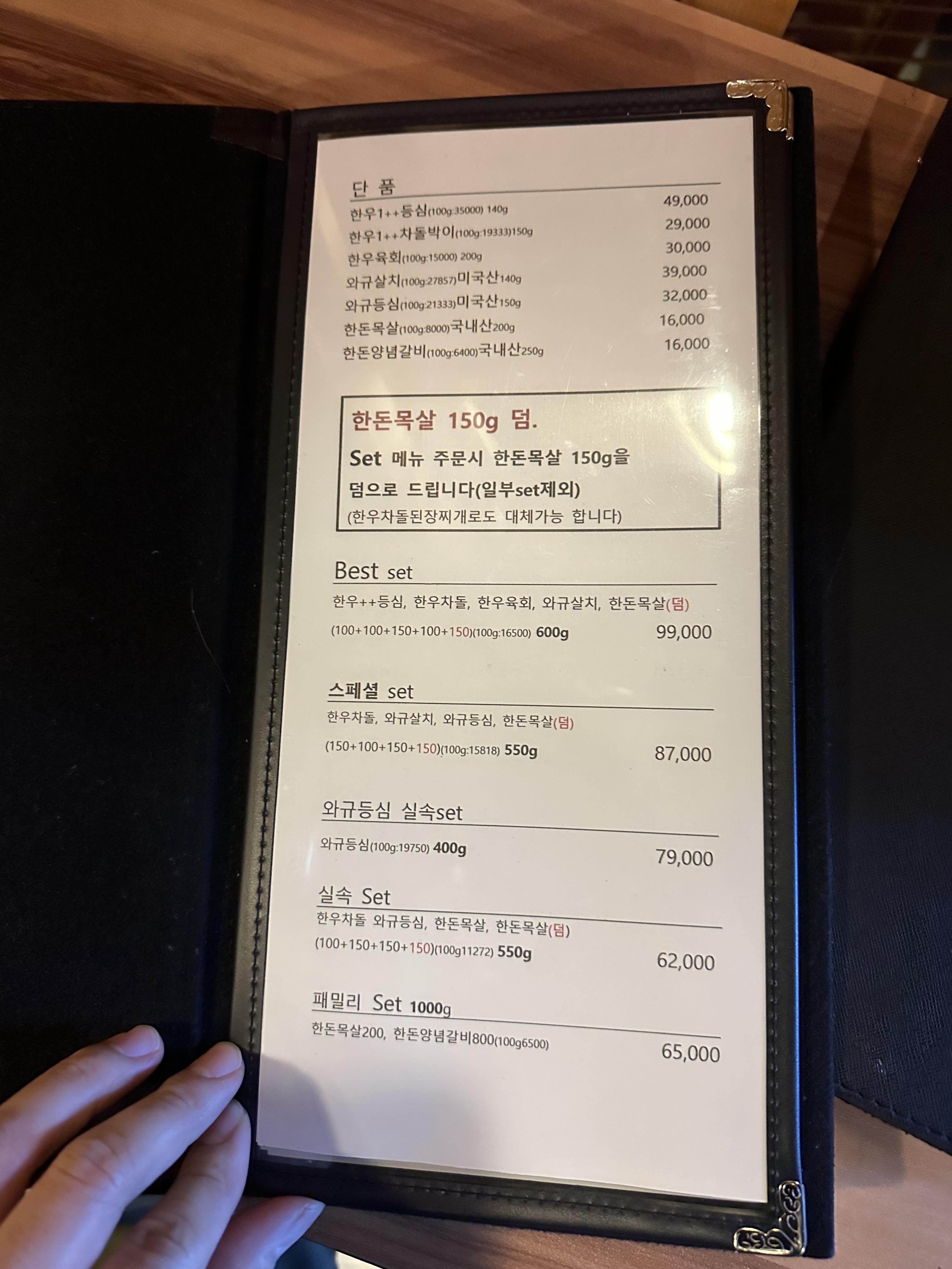 우선 고기는 한우1++, 와규, 한돈 크게 세 가지 종류로 준비되어 있어