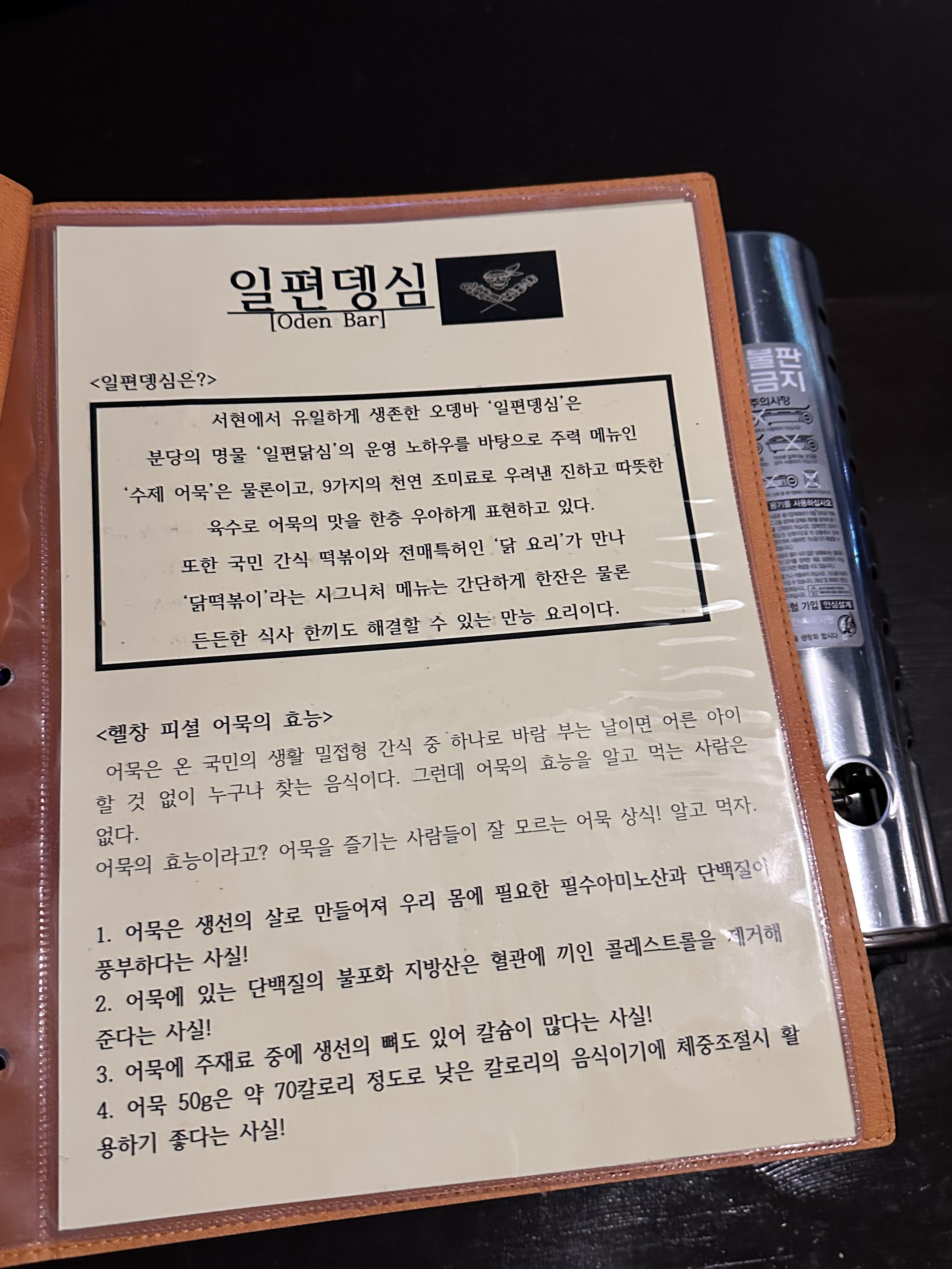 메인 메뉴는 오뎅집답게 어묵이 주를 이루며, 첫장에 소개된 닭볶이도 있다.