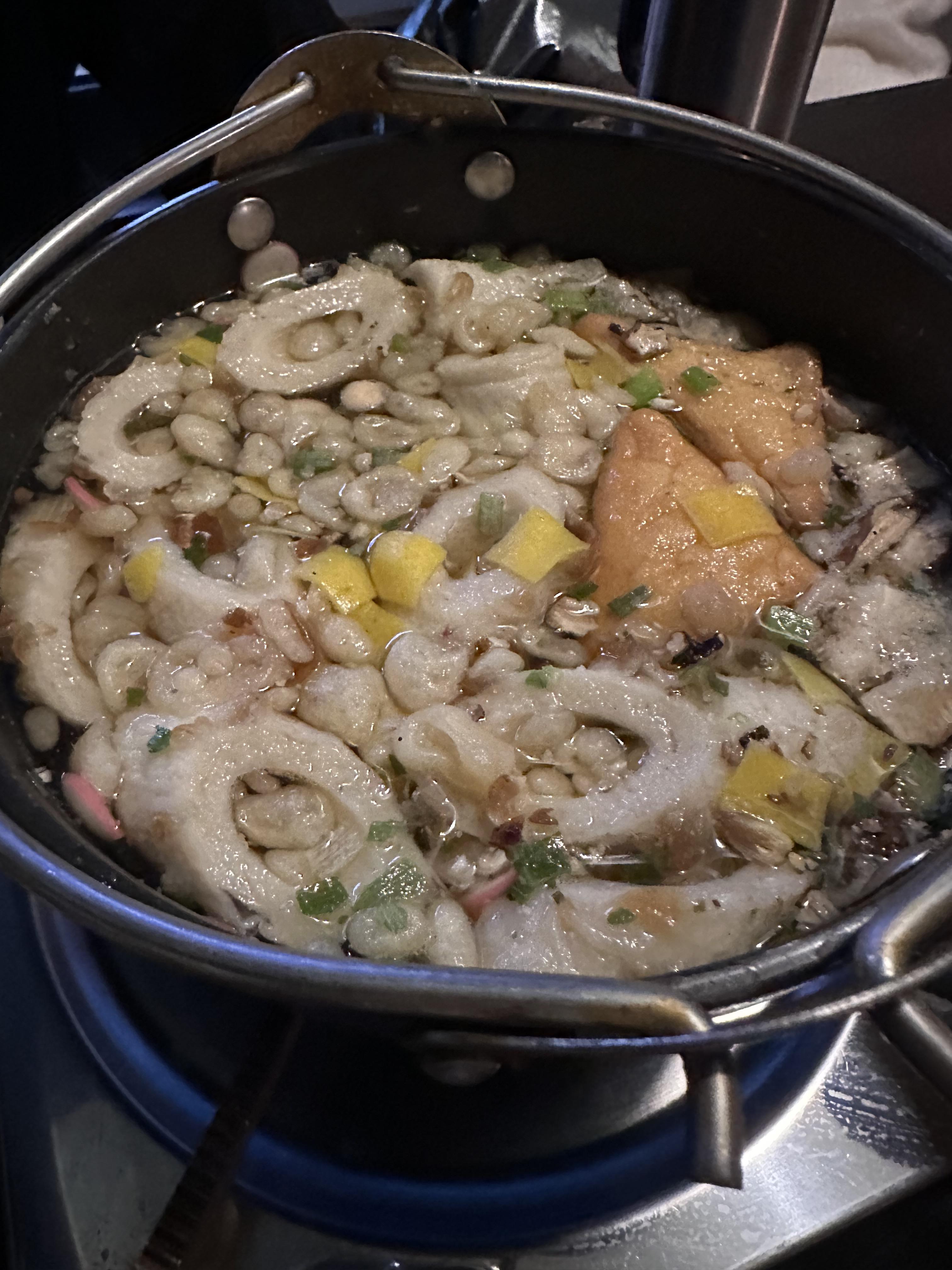 넙적한 모양의 고추당면과 탕에 잘려 들어가있는 치쿠와 & 두부생선.