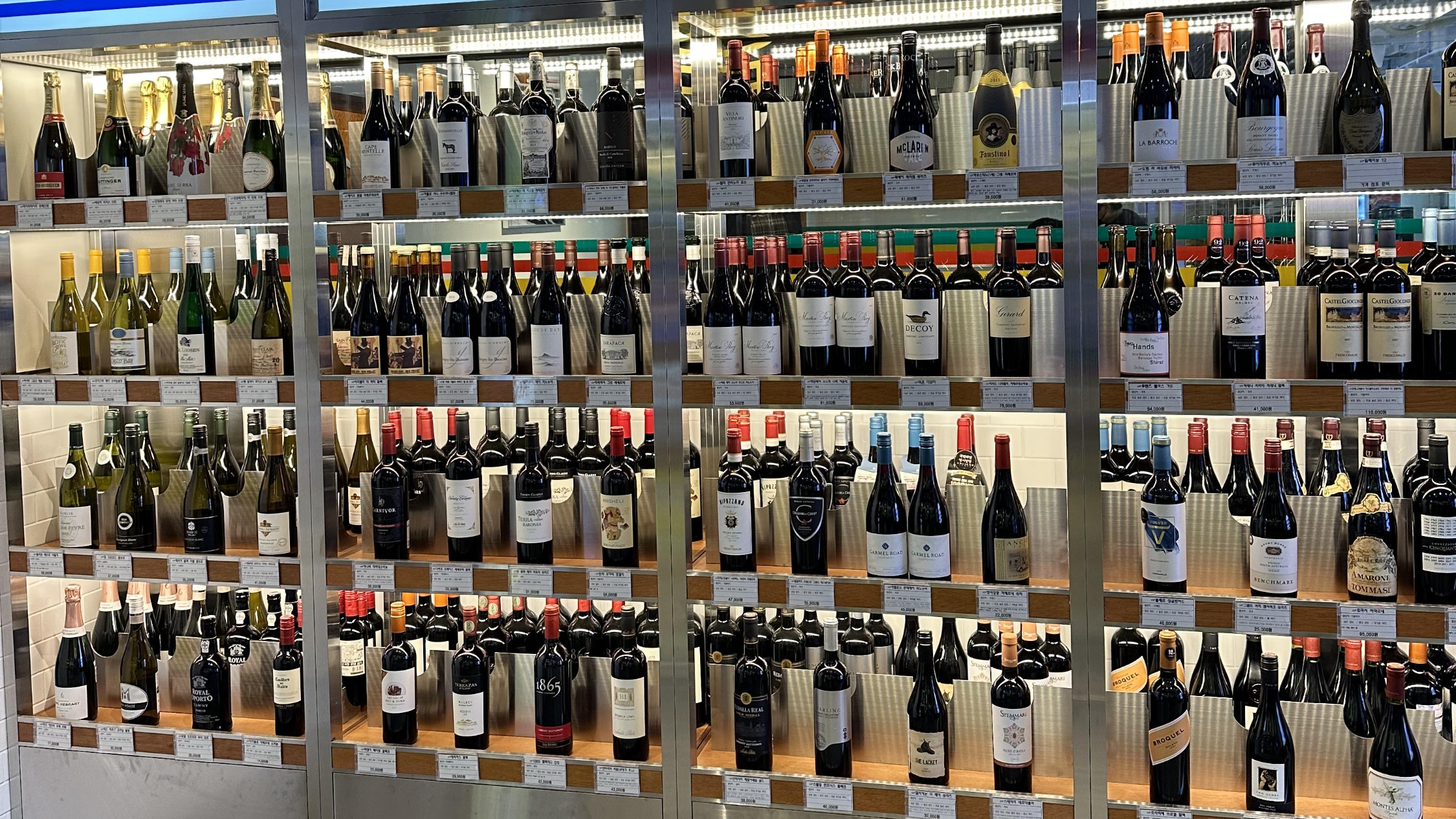 매장의 입구에는 상당한 종류의 와인이 준비되어 있다.