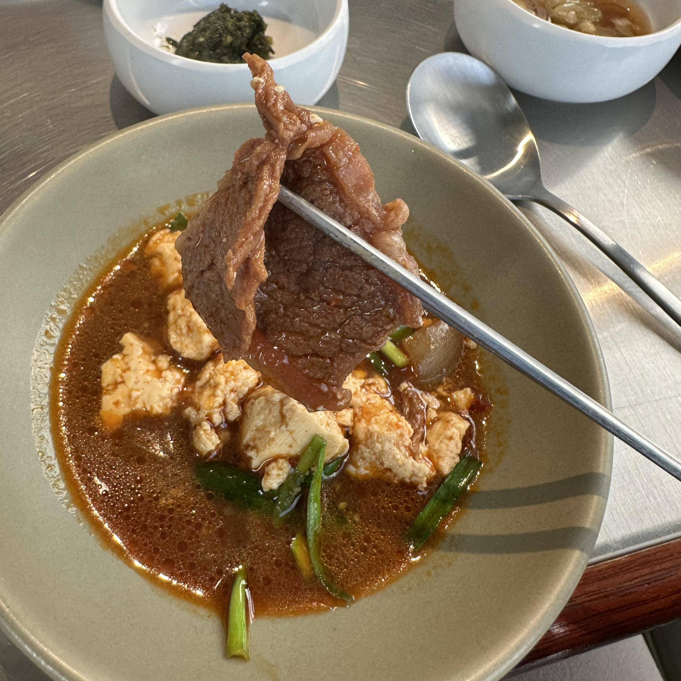 집 된장과 손두부를 이용하여 끓였으며, 가격은 8,000원인데 전혀 아깝지 않을 만큼 맛있다. (공기밥은 미포함)