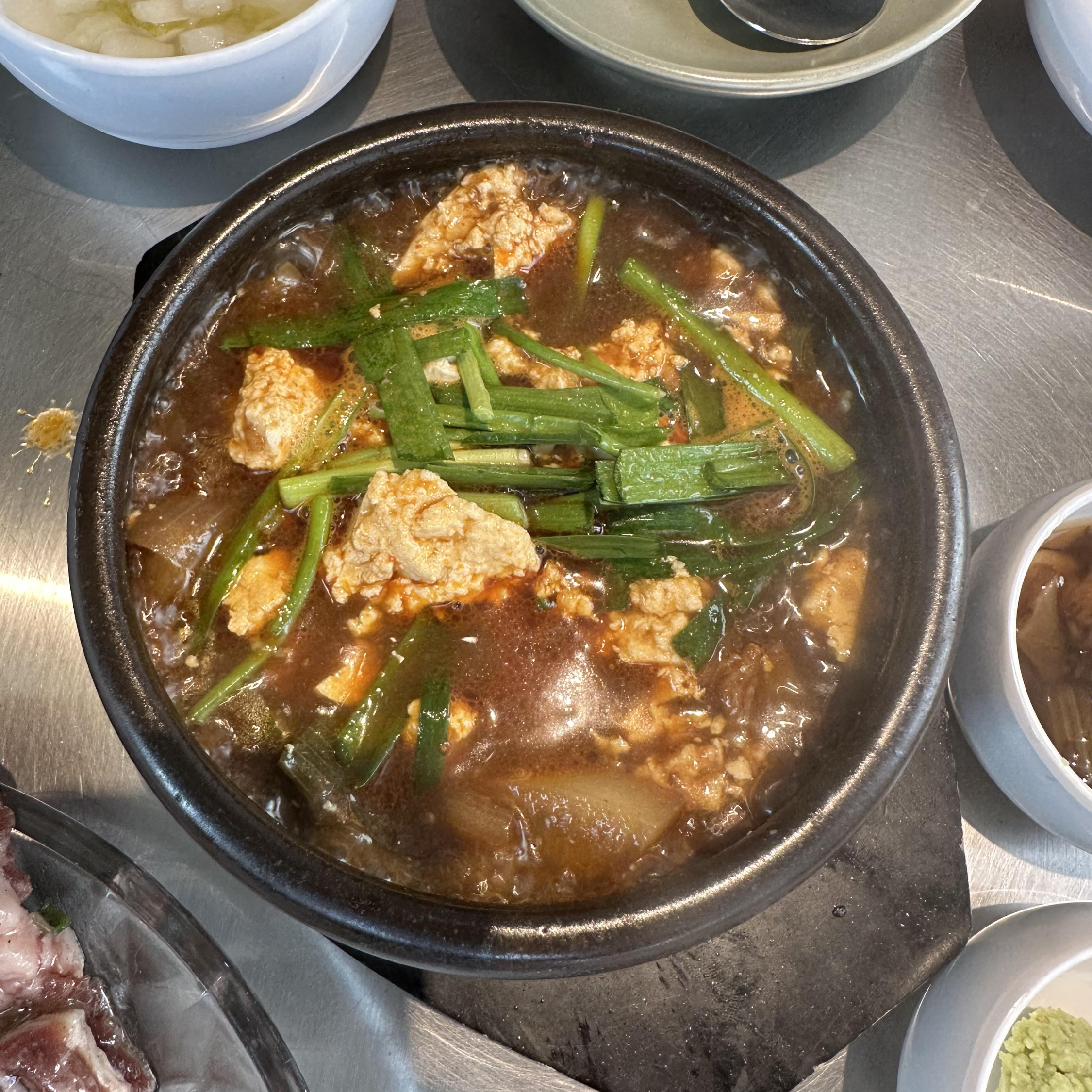 집 된장과 손두부를 이용하여 끓였으며, 가격은 8,000원인데 전혀 아깝지 않을 만큼 맛있다. (공기밥은 미포함)