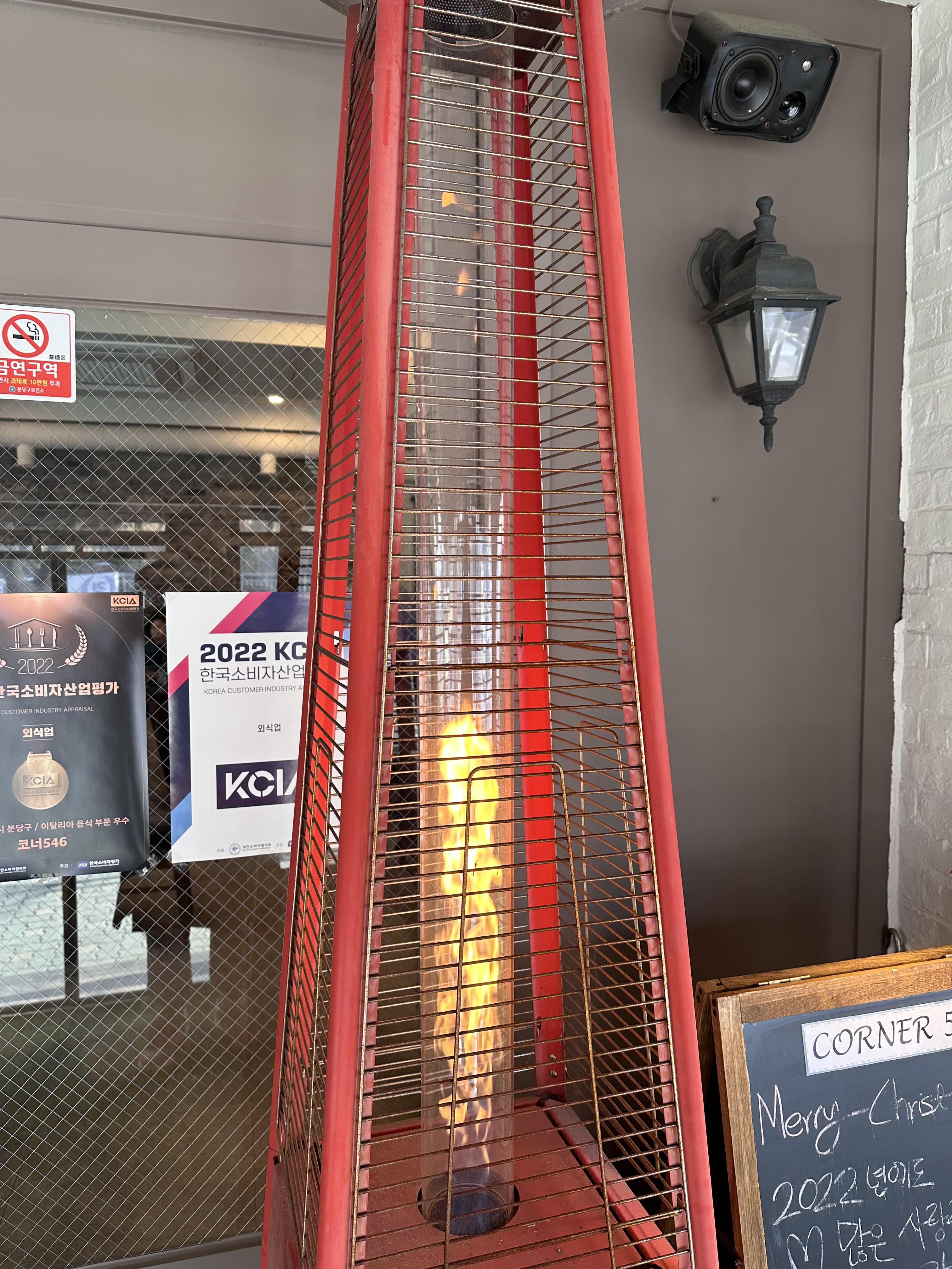 테라스석이 마련되어 있으며, 유럽 감성 물씬 나는 불기둥 석유난로(?)가 공기를 뎁혀주고 있었다.
