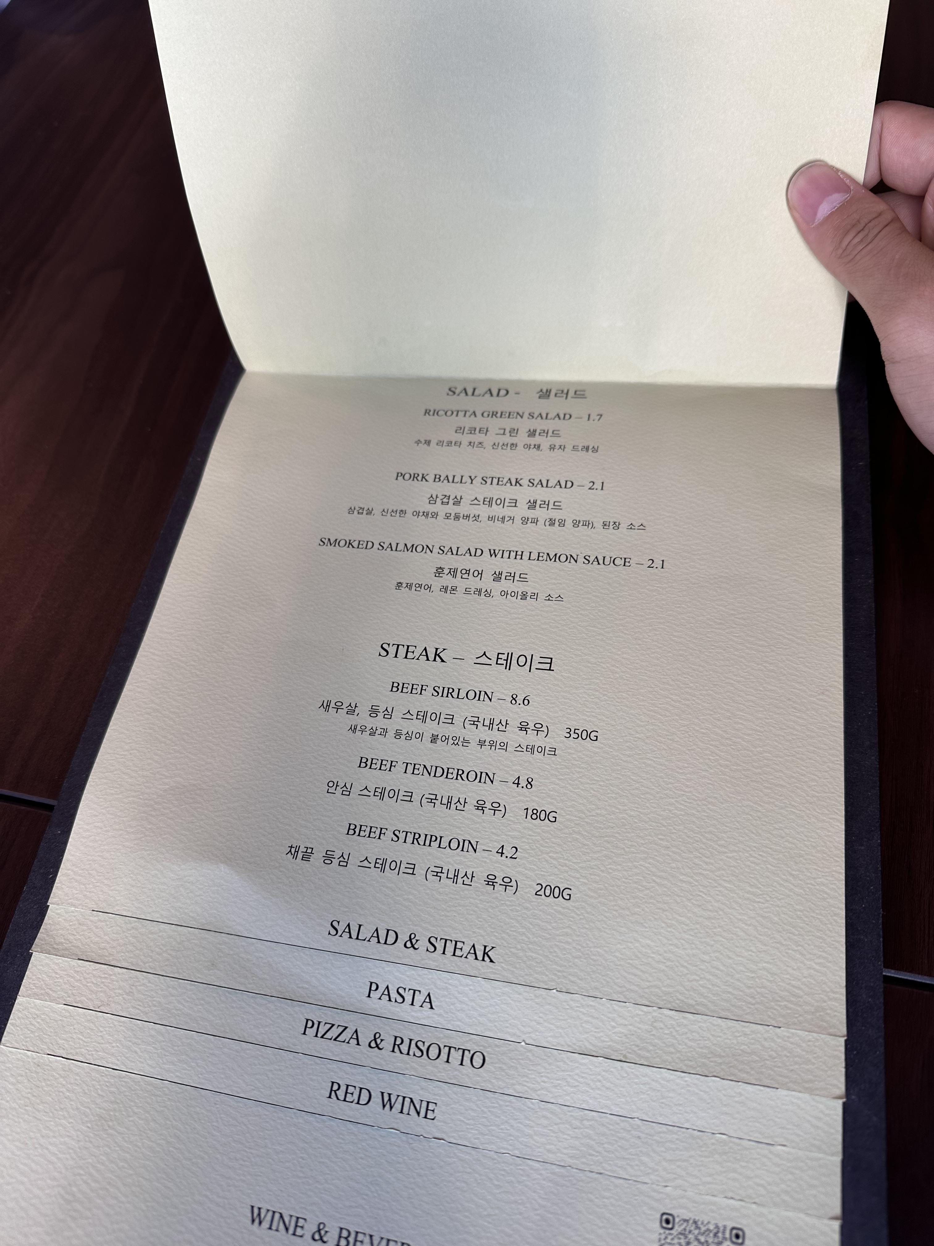 메뉴는 크게 샐러드 / 스테이크 / 파스타 / 피자 / 리조또로 분류되어 있다.