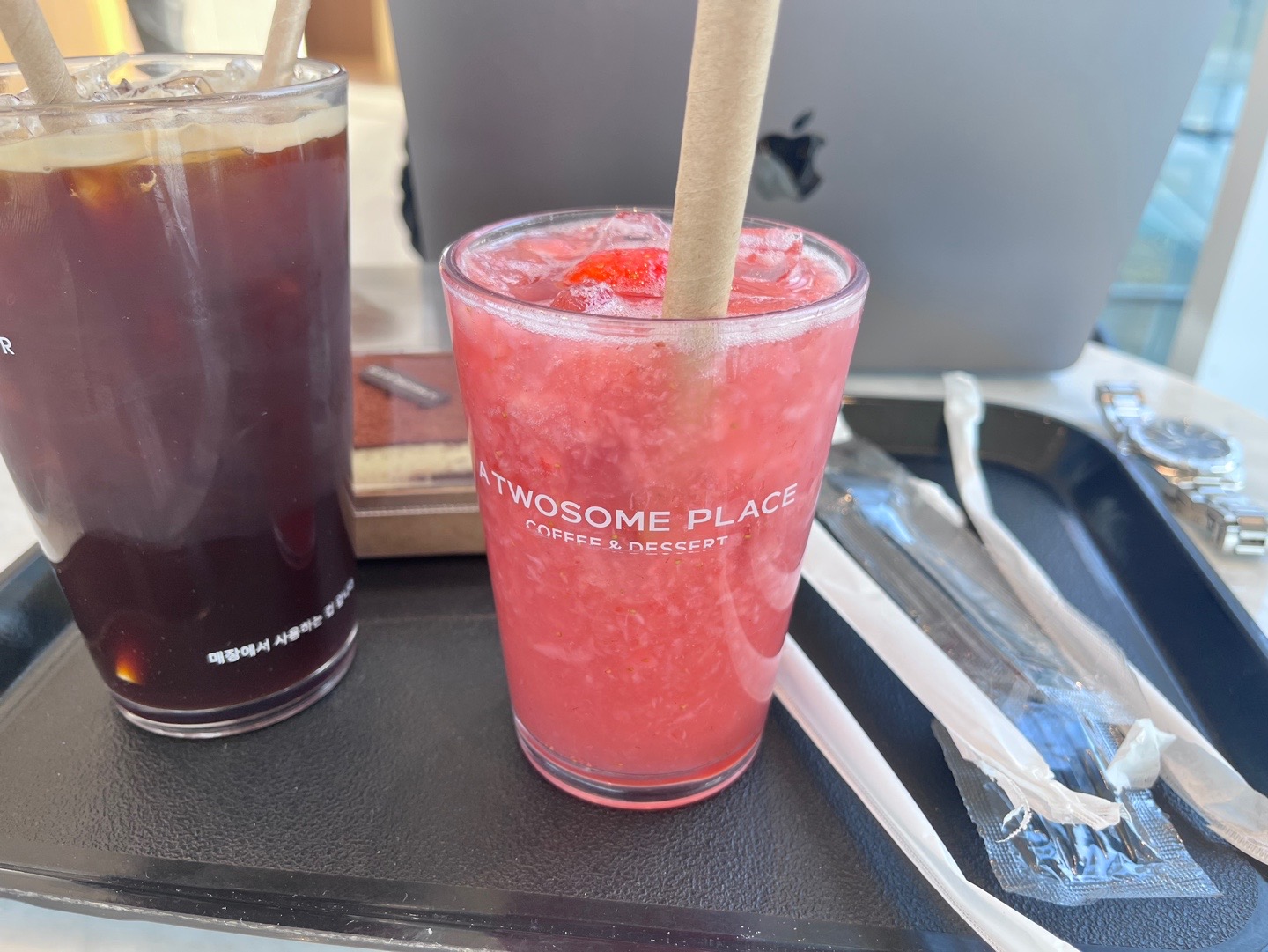 이번에 즐겨본 메뉴. 아이스 아메리카노와 생딸기가득주스, 그리고 티라미수