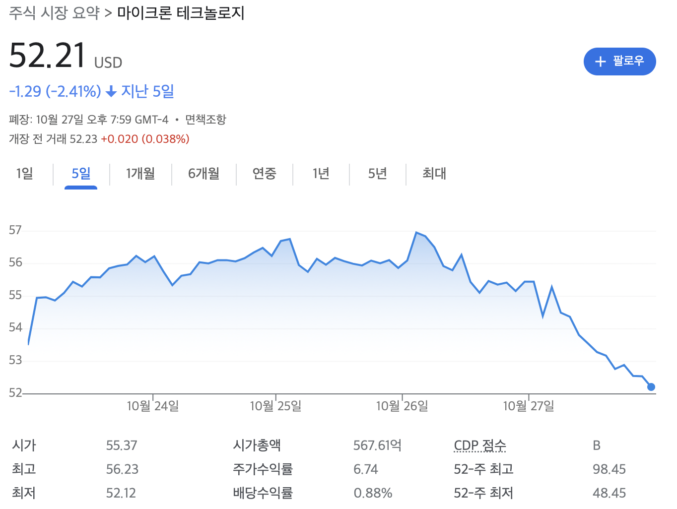 어닝이 SK하이닉스만 안좋은 것은 아니다. 메모리 반도체 1위 기업인 삼성전자는 매출은 76조원으로 소폭 상승하였으나, 영업이익은 10조 8000억원으로 지난 분기 대비 31.7% 급감하였다. 또한 미국 업체인 마이크론은 주당 순이익(EPS) 가 $1.45로 시장 예상치 $1.37를 소폭 상회하였으나, 매출이 $6.64B으로 컨센 $6.73B 대비 낮게 나와 어닝 쇼크를 냈다.